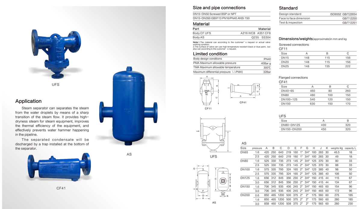 汽水分離器為壓力容器結(jié)構(gòu)碳鋼或不銹鋼設(shè)備,須安裝于水平管線上,排水口垂直向下,所有口徑的汽水分離器均帶安裝支架,以減小管道承載。為確保被分離的液體迅速排放,應(yīng)在分離器底部的排水口連接合適的一套疏水閥組合。 汽水分離器用于蒸汽、壓縮空氣及其它氣體系統(tǒng)可除去蒸汽、空氣或氣體等系統(tǒng)中所含水分。本類閥門在管道中一般應(yīng)當(dāng)水平安裝 上一個(gè)產(chǎn)品: