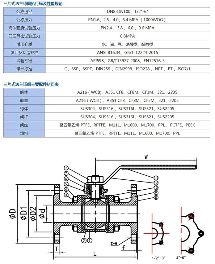 進口三片式法蘭球閥結構,對裝在管道上的閥門可直接在線檢查與維修,能有效減少裝置停車,降低成本; 三片式球閥楔形密封結構,閥門是靠閥桿提供的機械力,將球楔壓到閥座上而密封,使閥門的密封性不受管線壓差變化的影響,在各種工況下密封性能都有可靠保證。 三片式法蘭球閥單閥座設計,消除了閥門中腔介質因異常升壓而影響使用安全的問題;三片式美標球閥低扭矩設計,特殊結構設計的閥桿,只需配一個小手把閥門就能輕松啟閉;啟閉無摩擦,這一功能完全解決了傳統閥門因密封面之間相互摩擦而影響密封的問題