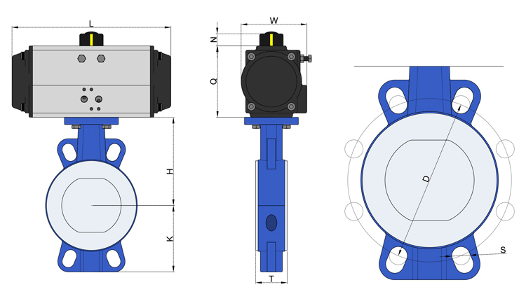 閥體一般由鑄鋼或不銹鋼制成。閥板通過閥桿與氣動執行機構連接,在閥體內旋轉實現開關和調節。密封由閥座密封和軸封組成,保證良好的密封性。