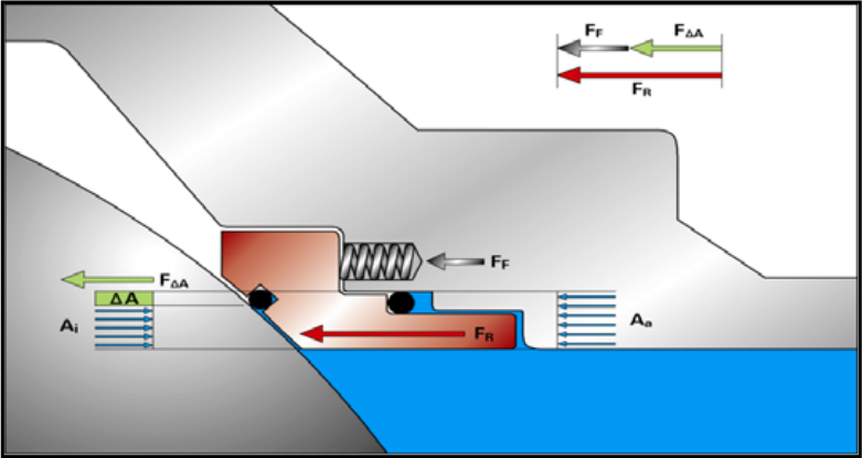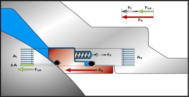 附圖 2.1 Double Piston Effect (DPE)結構及密封原理示意圖(干線壓力對閥座作用力)